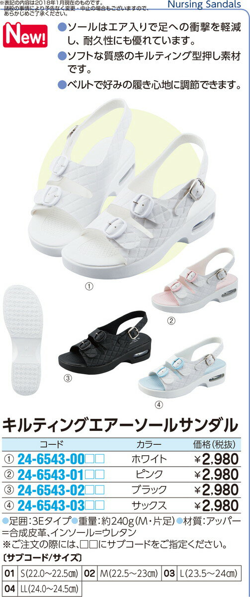 【病院専用商品】キルティングエアーソールサンダル ブラック品番 24-6543-02011入り 医療機器対象外 ウェア・ナースグッズ サンダル 定価\2980 JAN ●商品説明 ●ソールはエア入りで足への衝撃を軽減し、耐久性にも優れています。