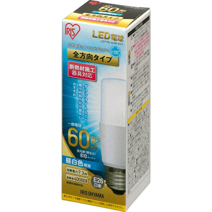 ●商品サイズ(cm)直径約3.7×高さ約10.9●商品重量約100g●口金サイズE26●光色相当LDT7N-G/W-6V1:昼白色相当LDT7L-G/W-6V1:電球色相当●定格消費電力7.3W●定格入力電流0.119A●全光束810lm●配光角約290°●設計寿命約40000時間●電源100V(50/60Hz共用)●使用場所屋内用●ランプ全体の明るさ一般電球60形相当●断熱材施工器具・密閉形器具○※断熱材施工器具や密閉形器具の種類によって保護回路が働き電力を抑えるため、明るさが低下する場合があります。