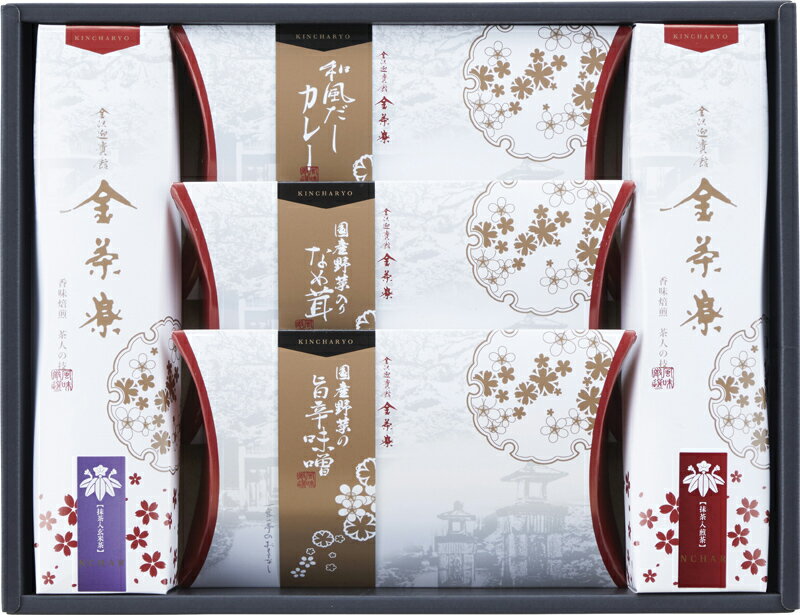 御進物等の贈り物セット 和の食材彩 味比べ詰合せ 料亭 金茶寮 和風だし一膳カレー(120g)・7種の国産野菜入りなめ茸(75g)・5種の国産野菜入り旨辛味噌(65g)・静岡深蒸茶ティーバッグ・抹茶入玄米茶ティーバッグ(各2.5g×7P)×各1