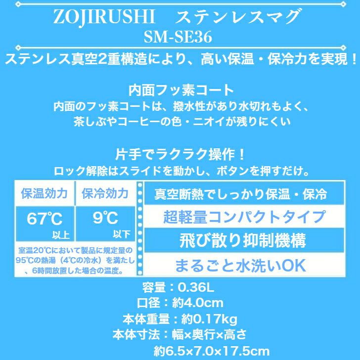 商品情報容量(L)0.36保温効力(6時間)67℃以上保冷効力(6時間)9℃以下口径(約cm)4.0本体寸法/幅×奥行×高さ(約cm)6.5×7.0×17.5本体重量(約kg)0.17【ZOJIRUSHI】 ステンレスマグ SM-SE36 AL 360ml ライトブルー 保温・保冷両用 水筒 魔法瓶 ステンレスボトル 象印 即日発送 5